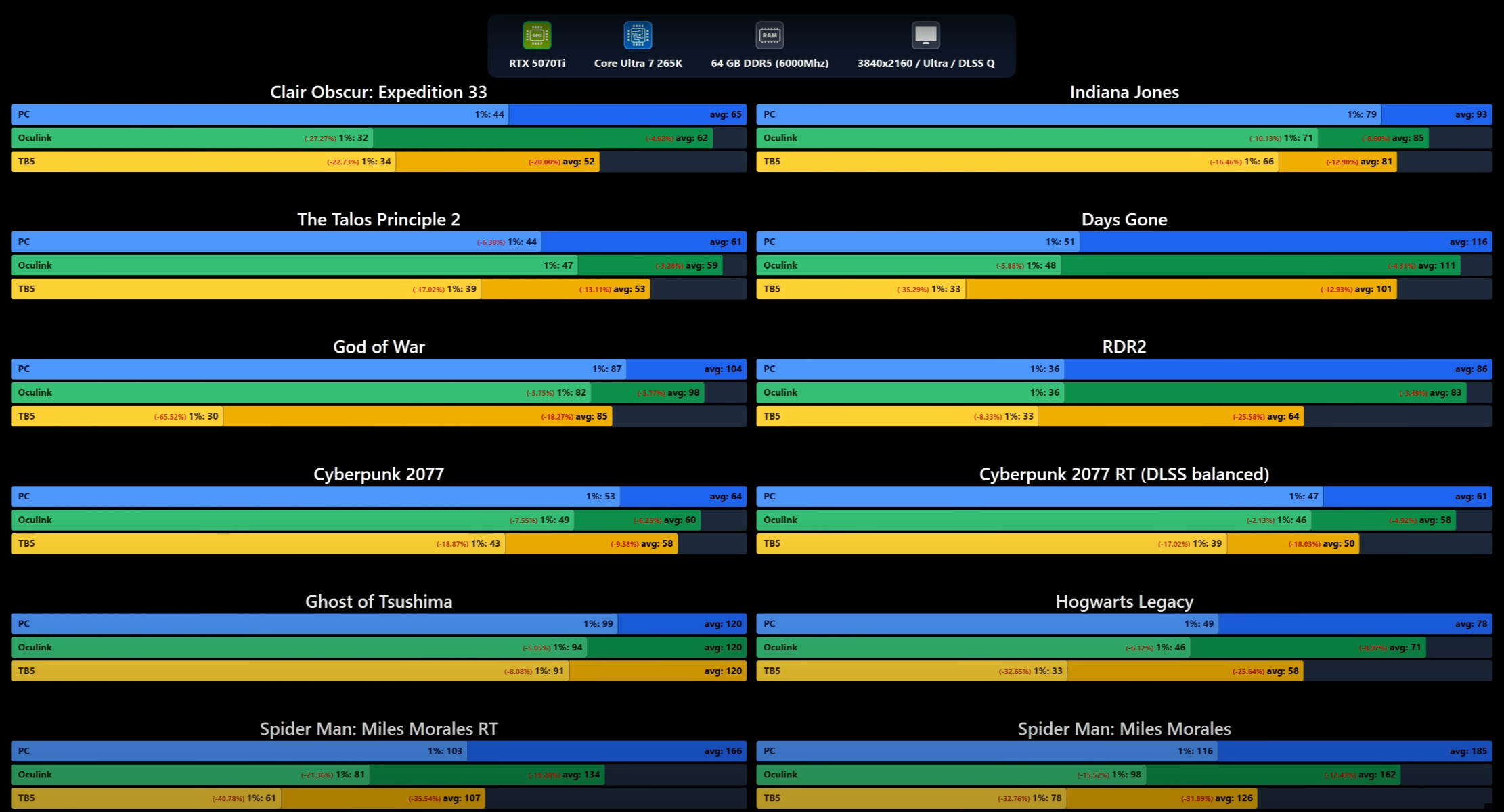 В результате Peladn Link S-3 ограничивает GeForce RTX 5070 Ti обеспечивает заметно меньшее количество кадров в секунду, чем при подключении того же GPU к устройству через OCuLink или в настольной системе. И не только это, но и то, что при подключении через Thunderbolt 5 1% FPS снижается сильнее, что, возможно, также приводит к менее плавному игровому процессу.