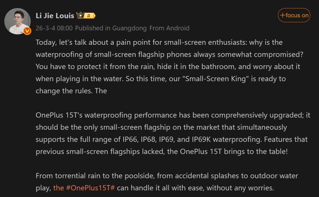 Грядущий флагманский телефон Snapdragon 8 Elite Gen 5 будет обладать "полным набором" водонепроницаемых характеристик. В тизере Луис упоминает рейтинги IP69K, IP69, IP68 и IP66. Это будет заметным обновлением по сравнению с флагманом прошлого поколения, который имел только рейтинг IP65, и эти рейтинги защиты от проникновения соответствуют тому, что предлагает OnePlus 15 (12/256 Гб по цене $768,87 на TradingShenzhen).