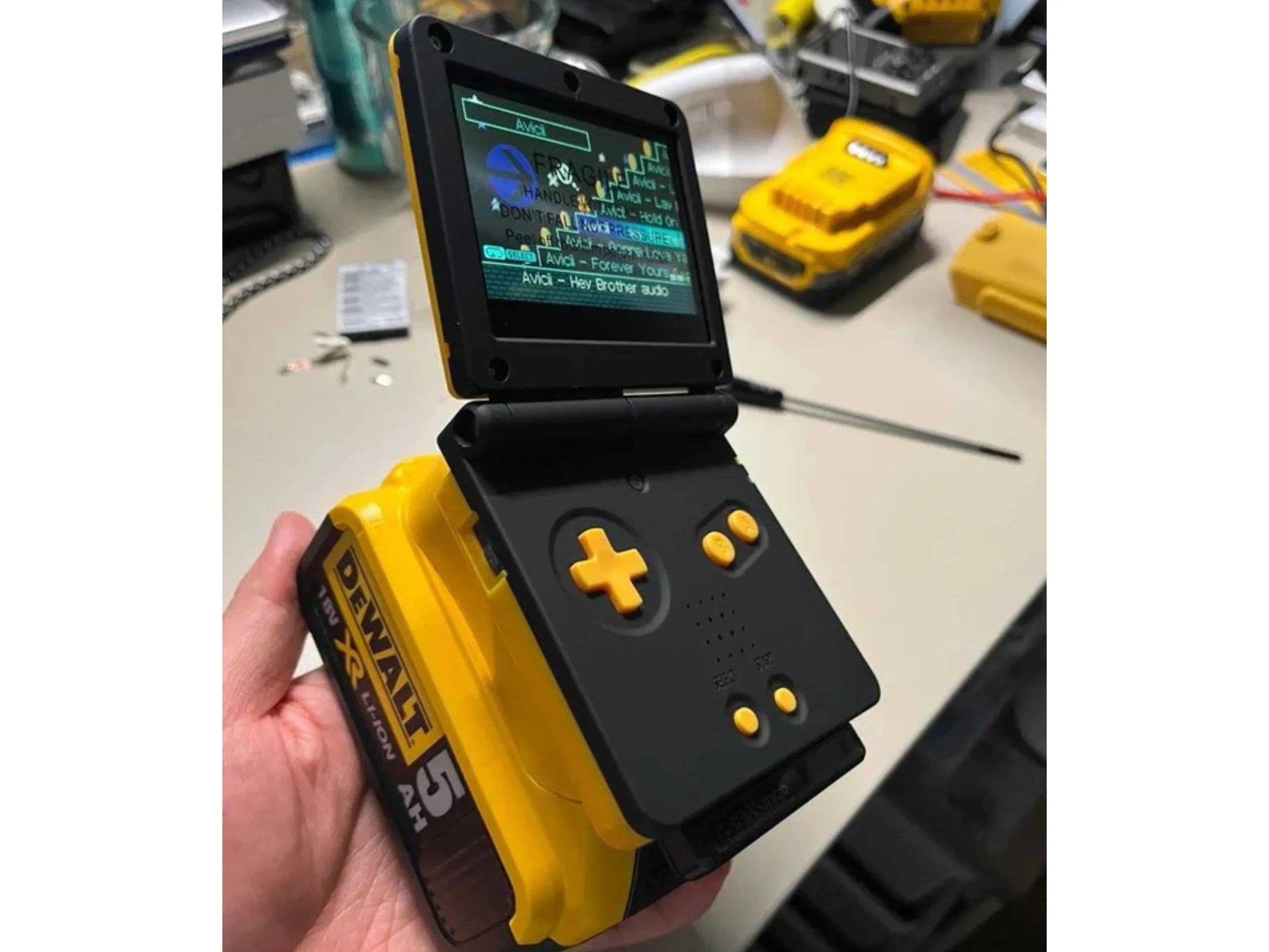 Стандартный Game Boy Advance SP(цена которого на Amazon в настоящее время составляет около $180) работает около 10 часов от оригинальной батареи. Для пользователя Reddit u/Bangooh этого оказалось недостаточно. Вместо того, чтобы выбрать обычную литий-ионную батарею, он пошел более нетрадиционным путем: взял аккумулятор DeWalt емкостью 162 000 мВт-ч - примерно 45 000 мА-ч при напряжении 3,6 В. Такой источник питания Вы обычно найдете в аккумуляторной дрели или даже газонокосилке.