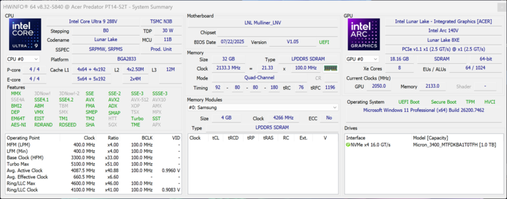 Аккумулятор емкостью 76 Вт-ч обеспечивает приемлемое время работы, но процессор Lunar Lake не дает здесь преимущества. С 9 часами в тесте WLAN при яркости 150 кд/м² и 6:45 часами при полной яркости Acer опережает Razer Blade 14 (72 Втч), но также явно отстает от ROG Zephyrus G14 (73 Втч).