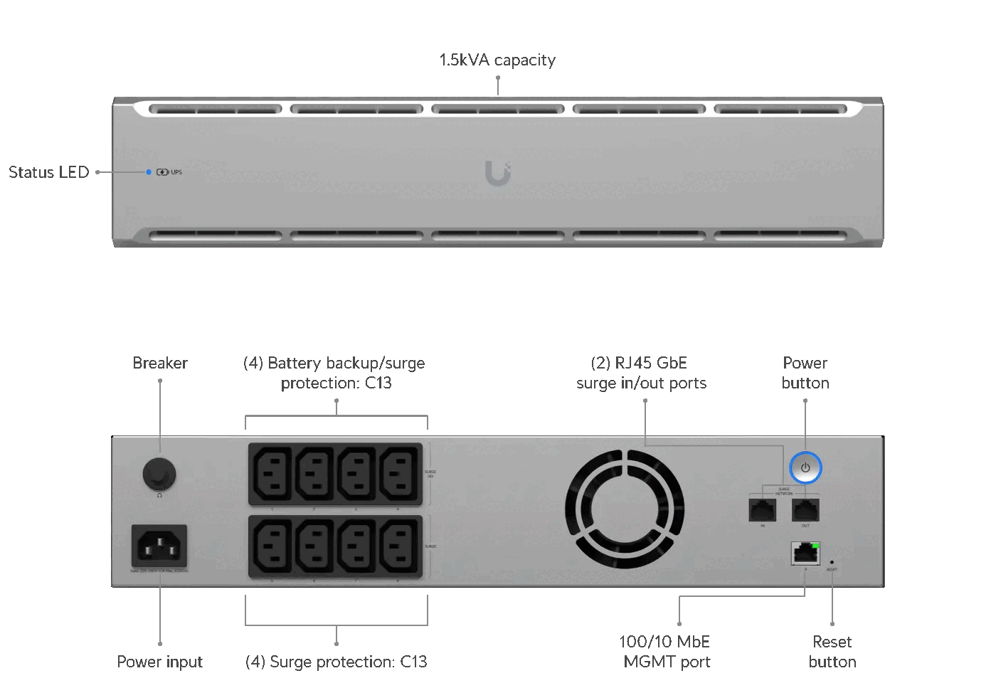 Unifi UPS Tower предназначен для размещения на настольных компьютерах. Помимо сетевого порта для интеграции Unifi и защиты от перенапряжения для сетевых подключений через GbE, башня предлагает в общей сложности десять портов C13 для вилок C14. Все порты имеют защиту от перенапряжения, а пять из них дополнительно поддерживаются внутренней батареей для непрерывного питания.