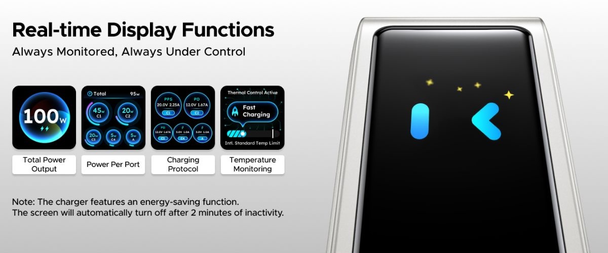Зарядное устройство Nexode Pro 100W поддерживает ряд протоколов, включая PD 3.0, QC 4.0 и PPS. На встроенном дисплее пользователи могут в режиме реального времени просматривать информацию о зарядке, например, распределение мощности, протокол(ы) зарядки и температуру. Кроме того, этот новый аксессуар Ugreen имеет складную конструкцию, что делает его более компактным.