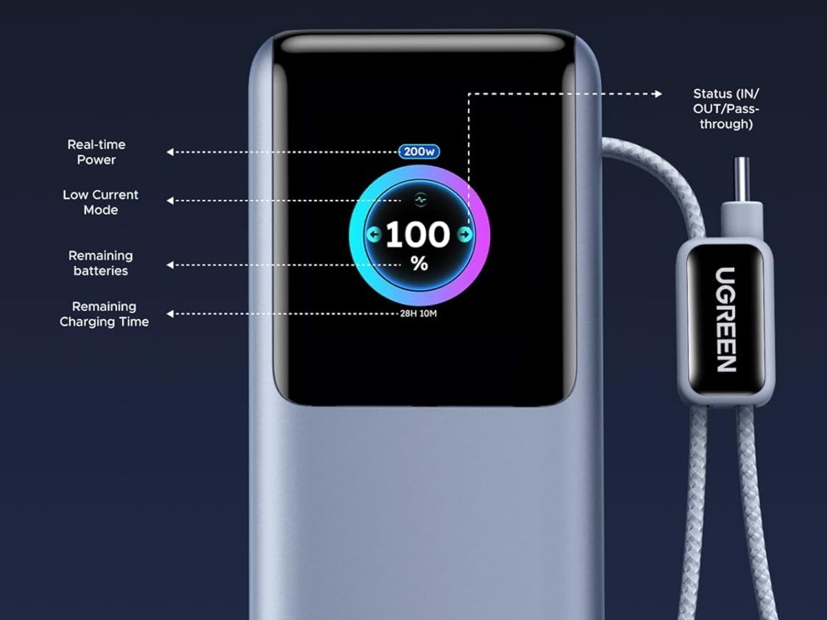 Ugreen выпускает новый пауэрбанк емкостью 25 000 мАч с двумя встроенными кабелями и умным дисплеем