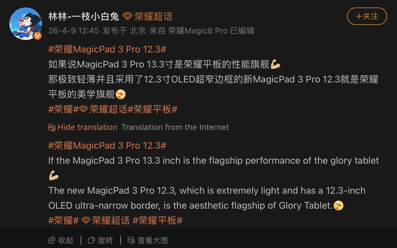 В отличие от iPad Proоднако на старте продаж MagicPad 3 Pro не был оснащен OLED-дисплеем. Согласно набору недавних тизеров , опубликованных на Weiboновый 12,3-дюймовый вариант планшета Honor MagicPad 3 Pro, похоже, уже не за горами. Он будет отличаться еще более тонким корпусом и OLED-дисплеем.