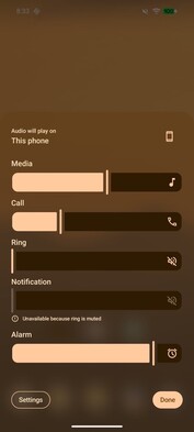 Этот новый подход к дизайну хорошо заметен, например, на панели громкости. Вместо сплошного фона, как раньше, теперь фон слегка прозрачный, а элементы за ним размыты гораздо сильнее, чем на устройствах Apple, чтобы улучшить читаемость. Google оттеняет эти прозрачные области с помощью акцентного цвета, выбранного пользователем.