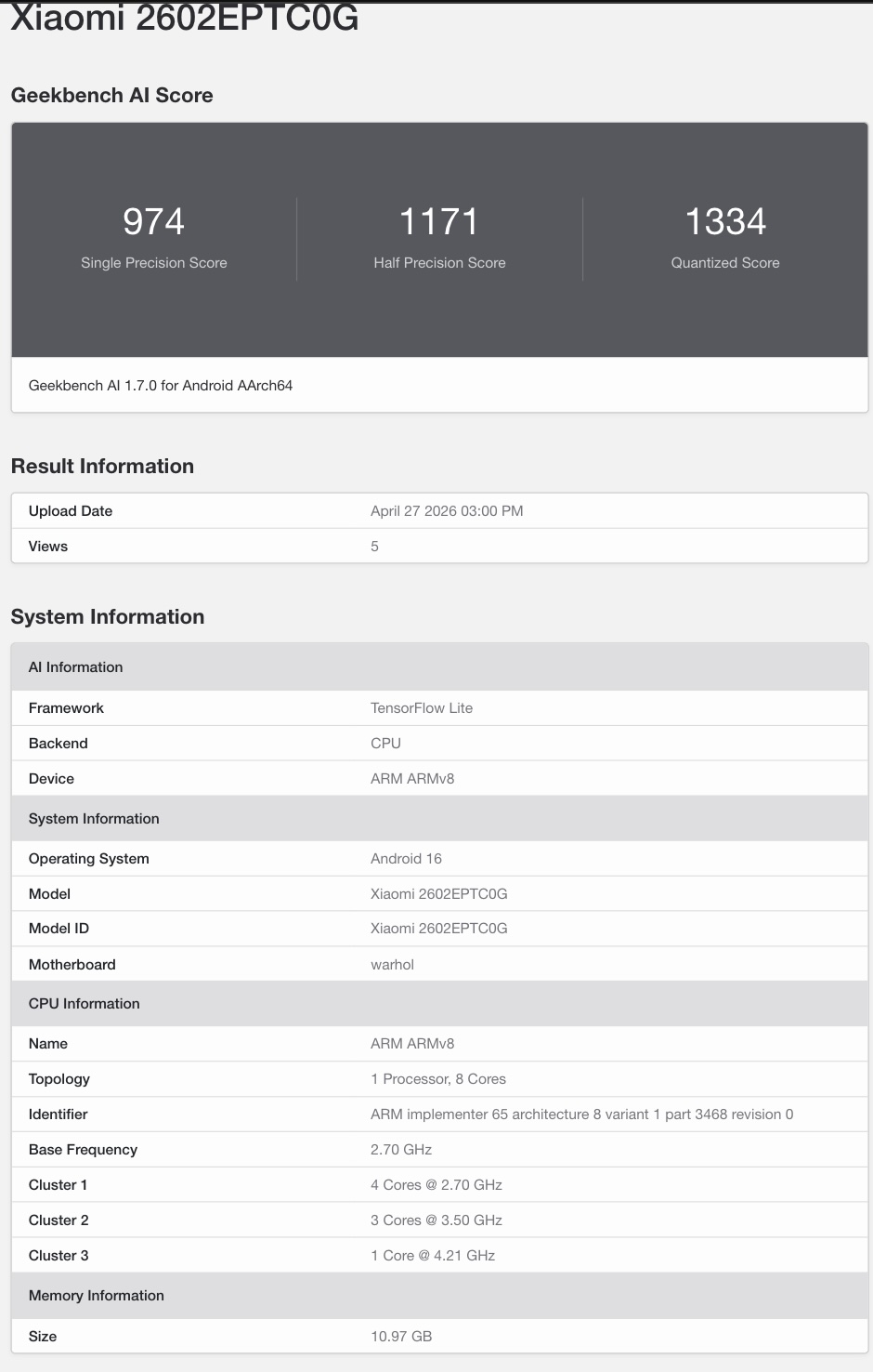 Согласно бенчмарку, Xiaomi 17T Pro будет работать на базе процессора Dimensity 9500 чипсет и 12 Гб оперативной памяти. Для справки, Dimensity 9500 - это флагманский чипсет от MediaTek, созданный по 3-нм техпроцессу, и на нем работают такие устройства, как Vivo X300 Pro и Oppo Find X9 Pro. В тесте Geekbench AI Xiaomi 17T Pro набирает 974 балла в тесте с одинарной точностью, 1 171 балл в тесте с половинной точностью и 1 334 балла в квантованном тесте.