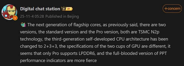 DCS утверждает, что оба новых мобильных процессора будут использовать одну и ту же архитектуру третьего поколения. В них также будет использоваться один и тот же технологический процесс TSMC N2P. Однако Pro будет обладать более мощными характеристиками, включая более высокую производительность GPU и поддержку памяти LPDDR6.