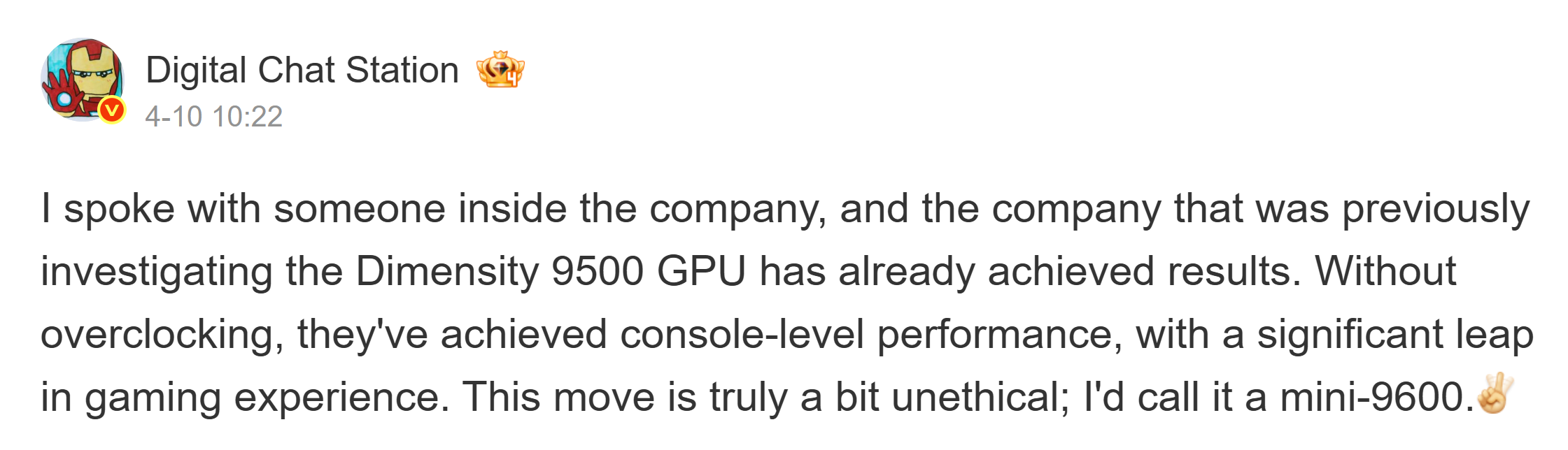 По сообщениям продюсера, компания пересмотрела графический процессор Dimensity 9500 и добилась хороших результатов. Этот подправленный GPU, который представляет собой ARM Mali G1- Ultra MC12, очевидно, может предложить производительность "консольного уровня" без какого-либо разгона.