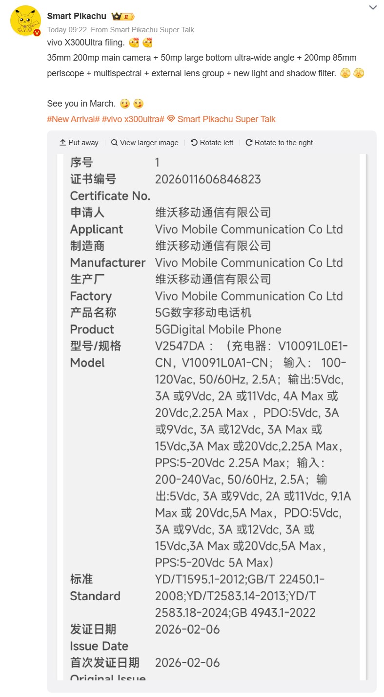 Утечки, такие как Smart Pikachu и Digital Chat Station, которые подчеркивают, что уже видели тестовые устройства воочию, также предоставили несколько новых лакомых кусочков информации о Vivo X300 Ultra. Бывший пишет, например, об улучшении качества видео при использовании телеконвертера, который также был переработан и, по мнению Digital Chat Station значительно опережает конкурирующие смартфоны. Высказываются предположения о том, что это может быть за "новая работа", и несколько раз упоминается оптический зум. Это подтверждает более ранние слухи об оптическом зуме, хотя, возможно, только с помощью внешней оптики, а не встроенной непосредственно в смартфон, как в модели Xiaomi 17 Ultra