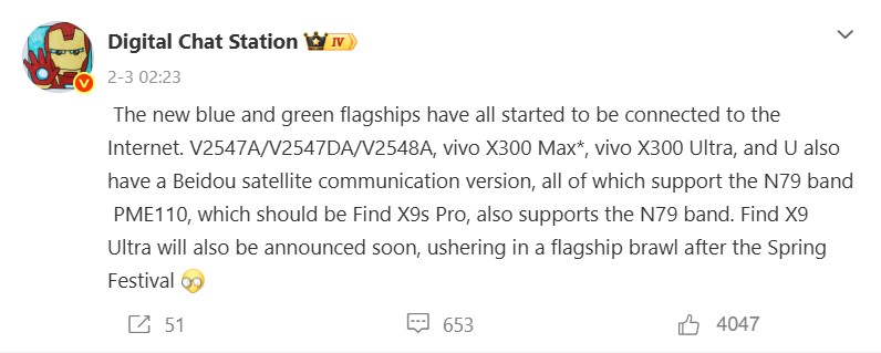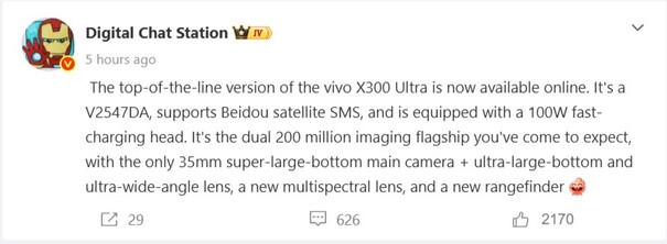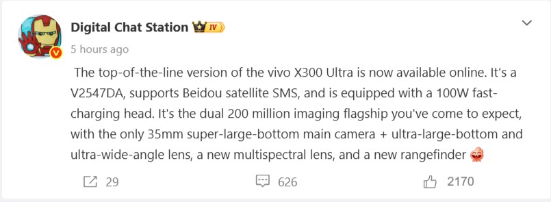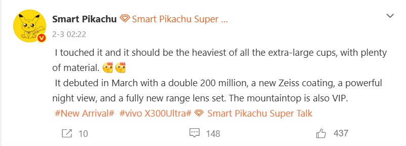 Значительное преимущество Vivo X200 Ultra перед конкурентами была и остается его ультраширокоугольная камера с диагональю 1/1,28 дюйма. Эта функция, вероятно, будет еще больше улучшена в преемнике, как недавно объяснил Digital Chat Station на Weibo. В частности, ожидается, что видеозаписи получат преимущества лучшего в отрасли ультраширокого угла. Еще одним интересным аспектом этого сообщения является комментарий, в котором упоминается Vivo X300 Max, который, по-видимому, будет представлен в Китае одновременно с Vivo X300 Ultra и, скорее всего, будет более крупным Vivo X300 с аналогичными характеристиками камеры