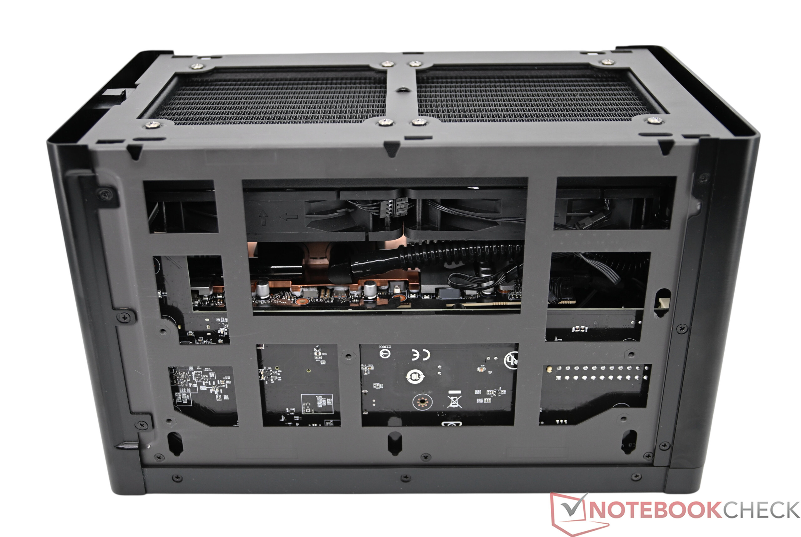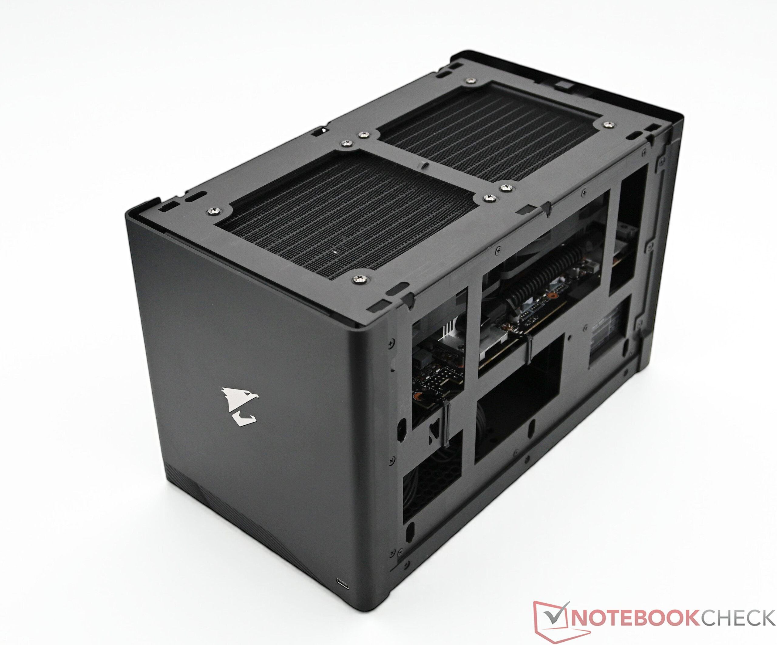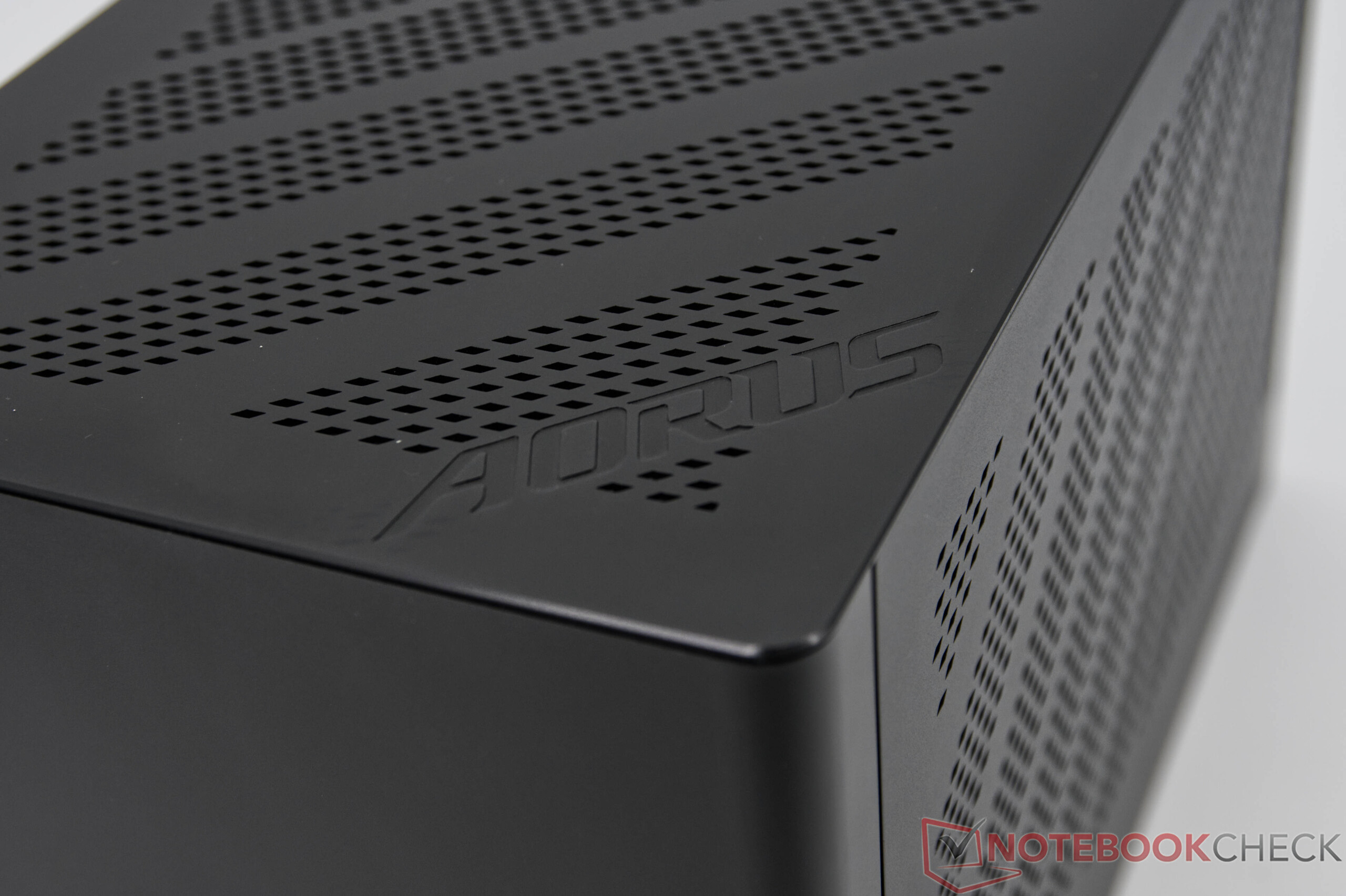 Gigabyte объединяет GeForce RTX 5090 в Aorus RTX 5090 AI Box вместе с мощной системой охлаждения AiO и 850-ваттным блоком питания в особенно компактном, устойчивом корпусе. Он выполнен преимущественно из металла, что обеспечивает высокий уровень прочности и качественный внешний вид. Крышку и боковые панели можно снять без инструментов, а последние также оснащены пылевыми фильтрами, которые легко выдвигаются назад даже в закрытом состоянии. При необходимости корпус и установленные в нем компоненты можно разобрать. Что касается качества изготовления, то здесь практически нет никаких нареканий. Визуально корпус сдержанно выделяется подсвечивающимся логотипом AORUS на передней панели, эффект от которого можно регулировать через Gigabyte Control Center или полностью отключить при необходимости. Единственным недостатком является то, что на металлических поверхностях быстро появляются отпечатки пальцев.