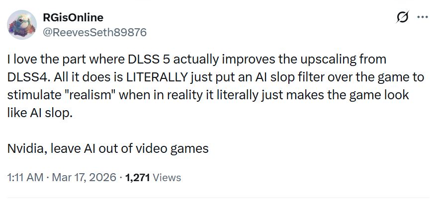 Большинство сетевых дискуссий вокруг DLSS 5 были крайне негативными, поскольку первоначальная реакция на DLSS 5 была довольно резкой. Некоторые называют его AI-отстоема другие сетуют на то, что DLSS 5 полностью разрушает художественное видение. Геймеры Nexus назвали Грейс в DLSS 5 "сгенерированной ИИ фотографией профиля знакомств, используемой для обмана пожилого человека в другой стране" GN также жалуется, что в ней "нет ни характера, ни души"