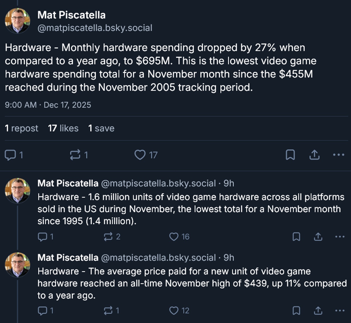 Sony может радоваться отчету Circana, но на рынке аппаратного обеспечения есть тревожные признаки. Общий объем продаж снизился на 27% по сравнению с тем же периодом в 2024 году. Расходы достигли $695 миллионов, что является самым низким показателем ноября с 2005 года. Розничные продавцы продали 1,6 миллиона устройств, что стало худшим результатом с ноября 1995 года.