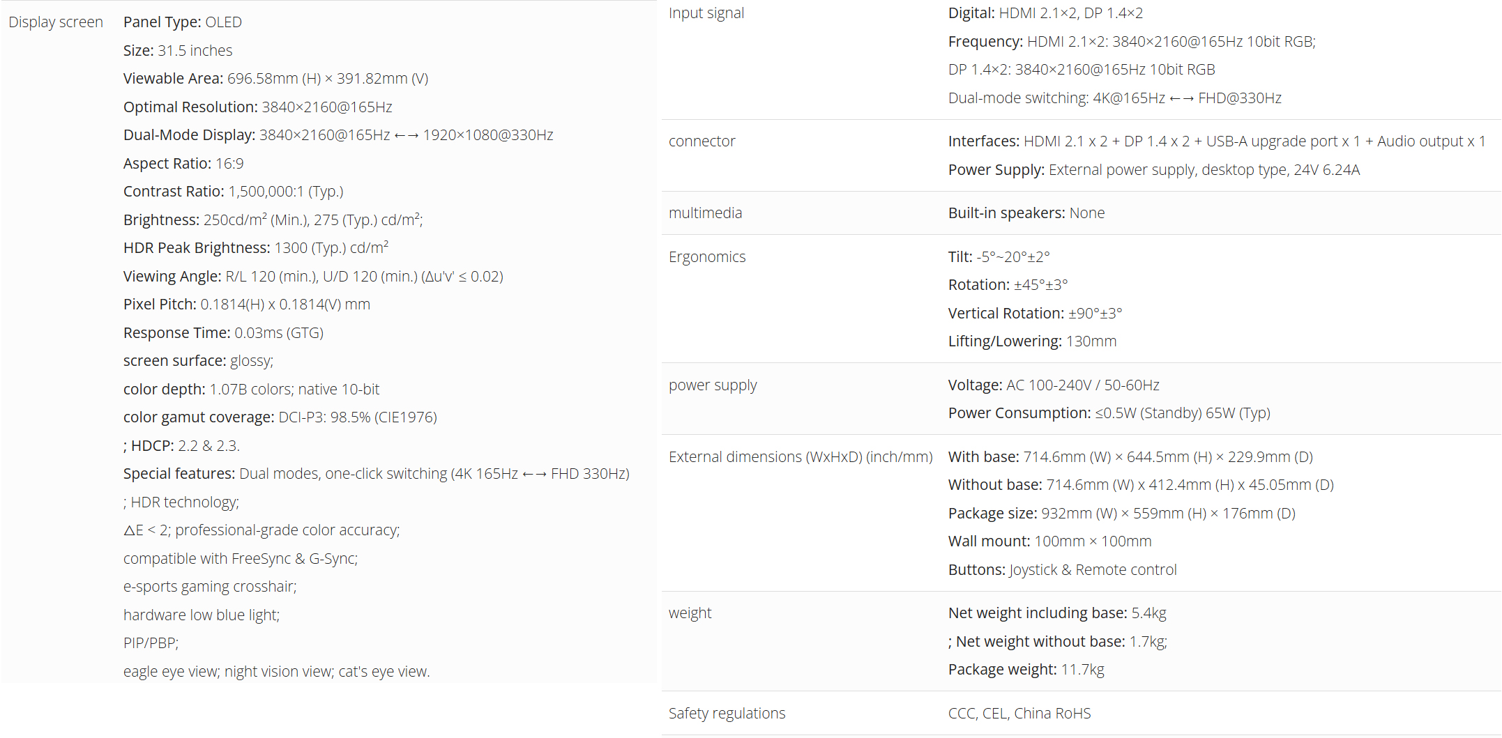 Хотя новый игровой монитор сохранил OLED-панель с двумя режимами, он может предложить частоту обновления 330 Гц в режиме разрешения 1080p и 165 Гц в режиме 4K. Для сравнения, xG323-4K-OLED2 который был выпущен в прошлом году, может работать с частотой 480 Гц в режиме FHD и 240 Гц в 4K.