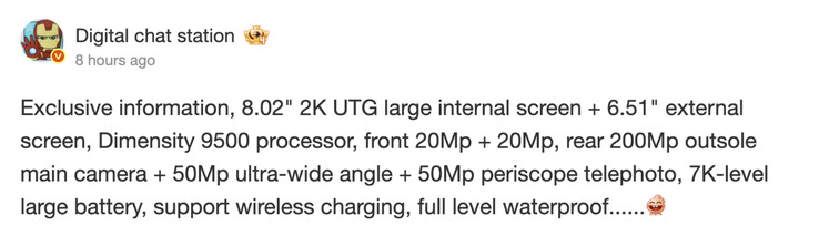 Кроме того, X Fold6 сохранит поддержку беспроводной зарядки и, как утверждает Digital Chat Station, водонепроницаемость "высшего уровня". Судя по всему, Vivo также переключится на MediaTek и его Dimensity 9500 чипсет для X Fold6. Чипсет Dimensity 9500, изготовленный по нормам 3 нм, уже можно найти в моделях Find X9и X300 и их аналогах Pro.