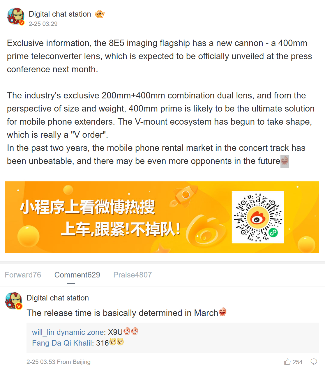 Кроме того, Digital Chat Station предположила, что к Vivo X300 Ultra также присоединится новый аксессуар - телеконвертер, позволяющий снимать с двумя эквивалентными фокусными расстояниями. В своем сообщении на Weibo автор утверждает, что аксессуар будет поддерживать режимы 200 мм и 400 мм в дополнение к ожидаемому 85-мм телеобъективу, входящему в комплект X300 Ultra.