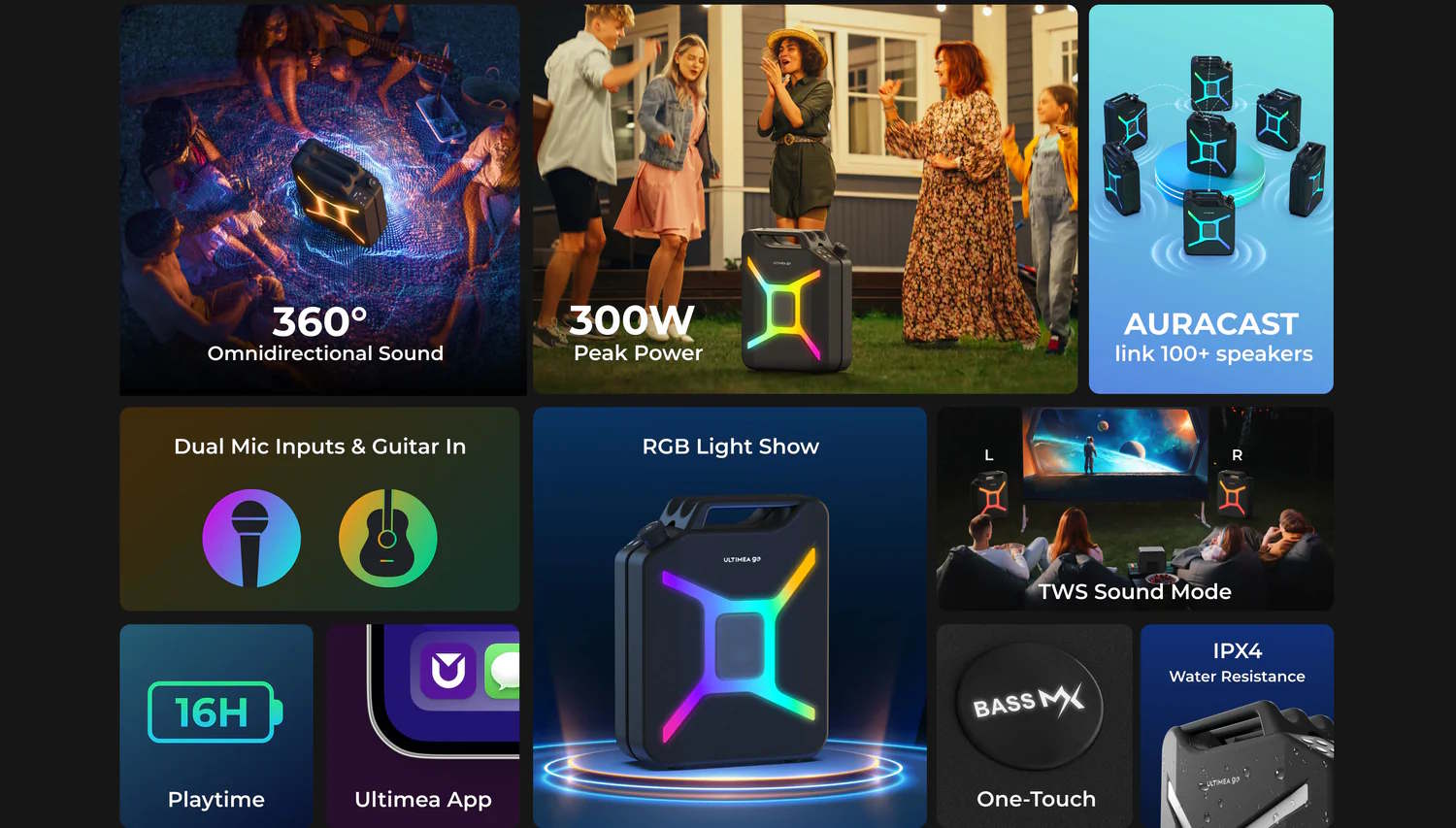 Отдельные динамики проецируют звук не только в одном направлении. По словам производителя, две колонки могут быть сопряжены для получения настоящего стереозвука, также поддерживается функция Auracast. Это позволяет синхронизировать воспроизведение на 100 устройствах, что дает возможность наполнить звуком весь дом. Время работы от аккумулятора составляет до 16 часов, а Ultimea Go, как утверждается, соответствует требованиям стандарта IPX4. В приложении Ultimea можно не только настроить освещение, состоящее из 133 RGB-светодиодов, но и отрегулировать параметры эквалайзера. Динамик можно приобрести через Amazon по цене 269 долларов.