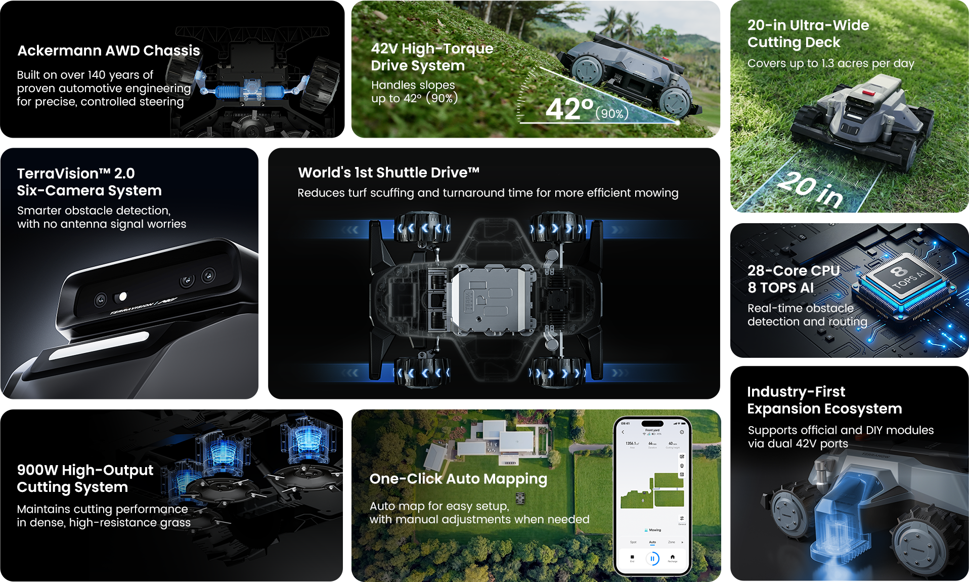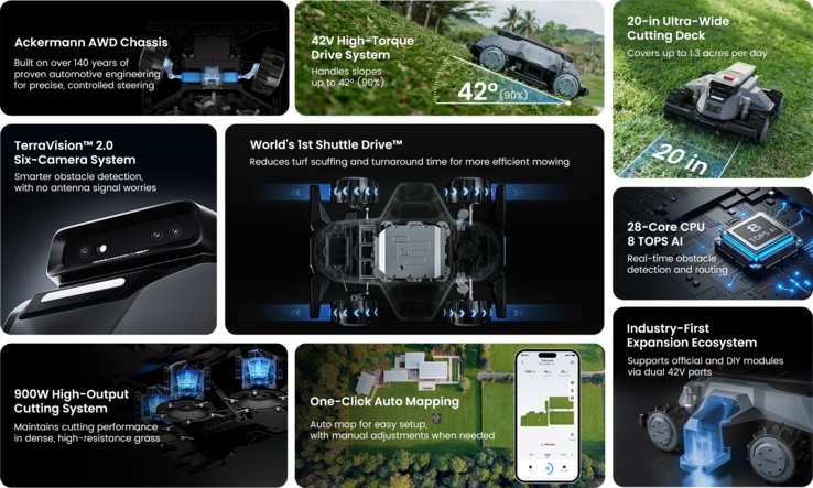 Картографирование предполагается осуществлять автоматически с помощью искусственного интеллекта, используя систему TerraVision 2.0 с шестью камерами и 28-ядерным процессором, обеспечивающим 8 TOPS производительности искусственного интеллекта. Расширяемая экосистема также звучит многообещающе.