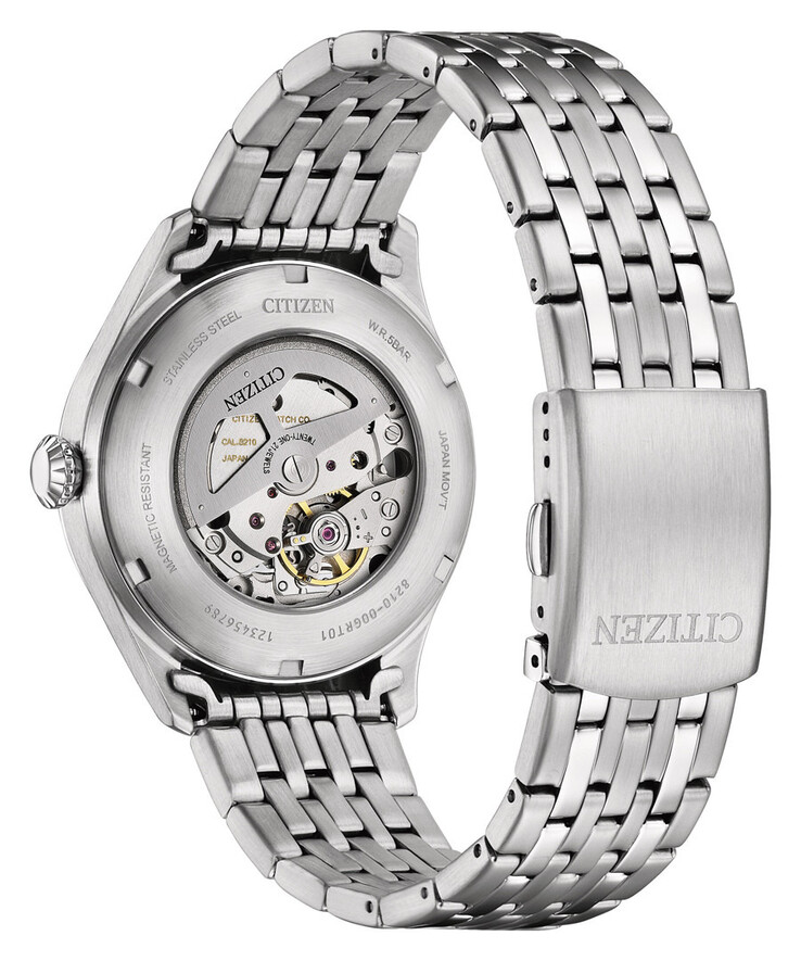 Модель NJ0240-55L работает на автоматическом механизме Caliber 8210. Это широко распространенный внутренний механический механизм от Citizen, работающий на частоте 21 600 полуколебаний в час с заявленным запасом хода около 40 часов. Диаметр корпуса составляет 40 мм, толщина - 11,6 мм, что соответствует стандартным пропорциям для часов повседневного ношения. И корпус, и браслет выполнены из нержавеющей стали, а спереди установлено минеральное стекло. Часы также обладают базовой водонепроницаемостью до 50 метров. Среди других функциональных элементов - указатель даты.