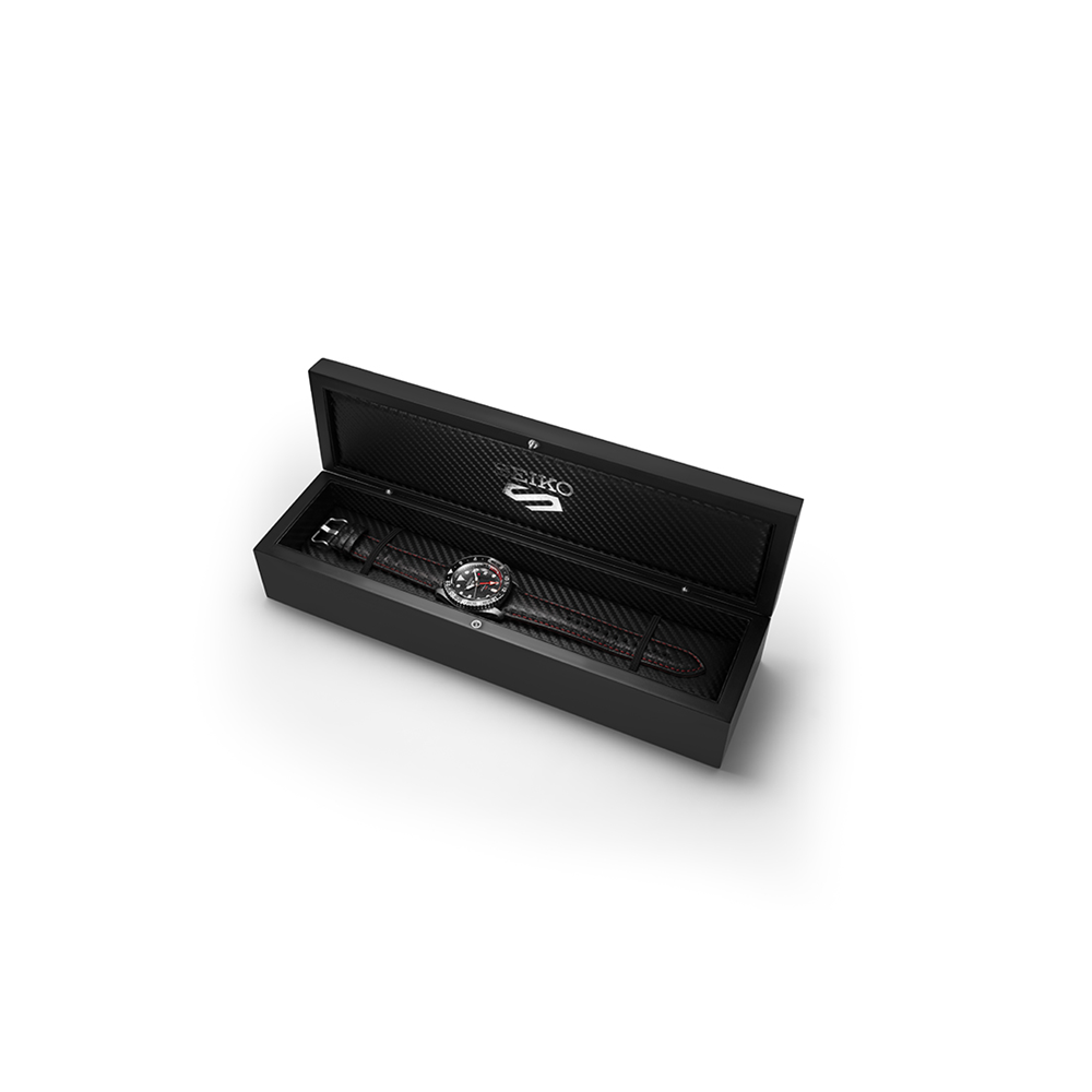 Начнем с самого очевидного: дизайна, который в значительной степени опирается на гоночную тематику. Циферблат с узором из углеродного волокна задает тон, отсылая к легким материалам, используемым в современных гоночных автомобилях, а красные акценты выделяют внутреннее кольцо глав, стрелку GMT и секундную стрелку, а Lumibrite на стрелках и часовых индексах обеспечивает видимость при слабом освещении. Логотип Supercars выгравирован как на заводной головке, так и на задней крышке корпуса, на которой также указан индивидуальный номер каждой лимитированной серии часов.