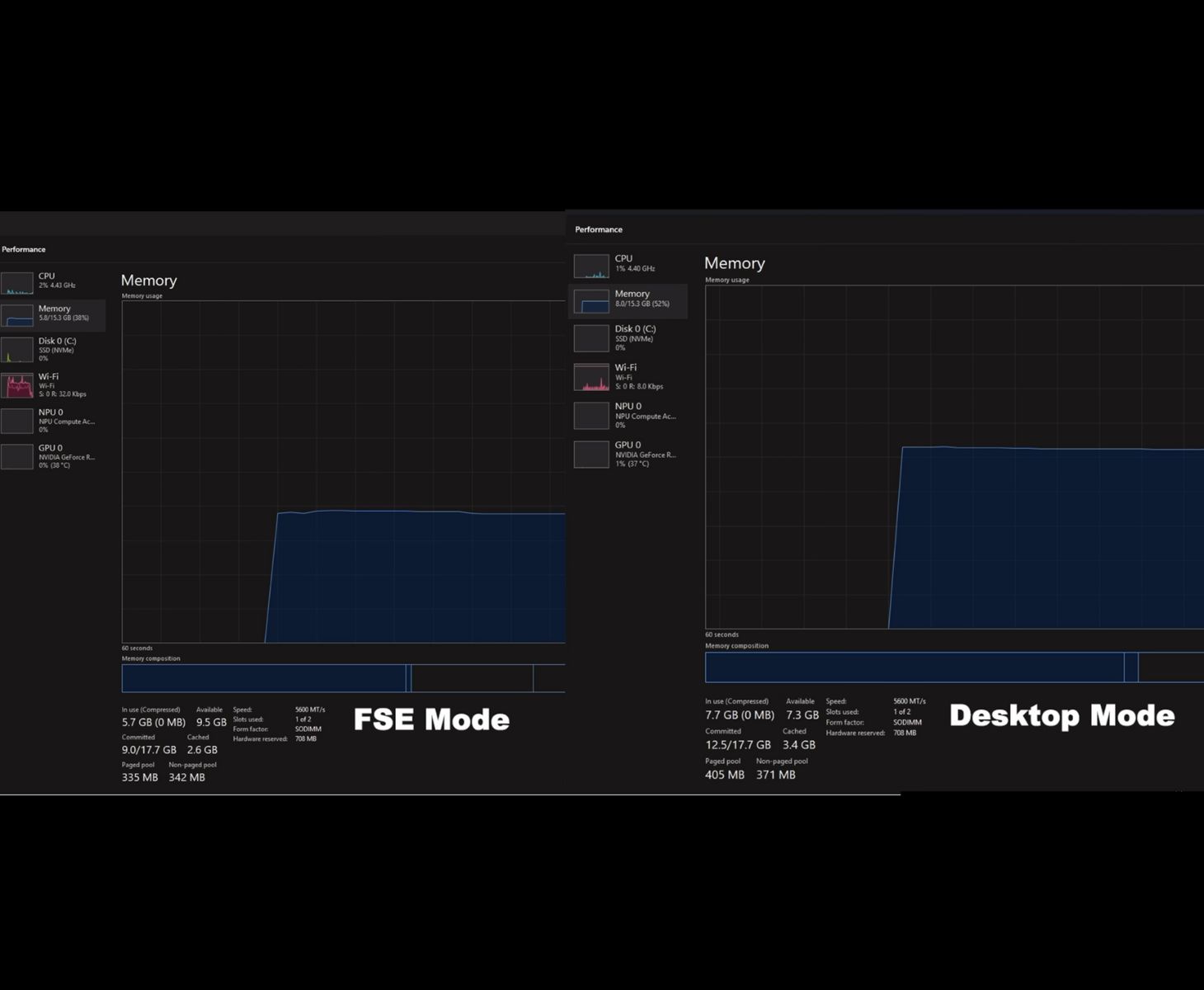 Примечательным аспектом FSE является его способность приостанавливать работу стандартного окружения рабочего стола Windows, сокращая количество фоновых процессов и снижая общее потребление памяти. В ходе тестирования, показанного YouTuber'ом, игровой ноутбук, оснащенный Nvidia GeForce RTX 5050 использовал около 5,7 ГБ оперативной памяти в режиме FSE по сравнению с 7,7 ГБ в обычном режиме рабочего стола, что соответствует Заявлением Microsoft об экономии примерно 2 ГБ. Такое сокращение может существенно помочь системам с ограниченным объемом памяти или конфигурациям с интегрированной графикой, которые полагаются на общую оперативную память.