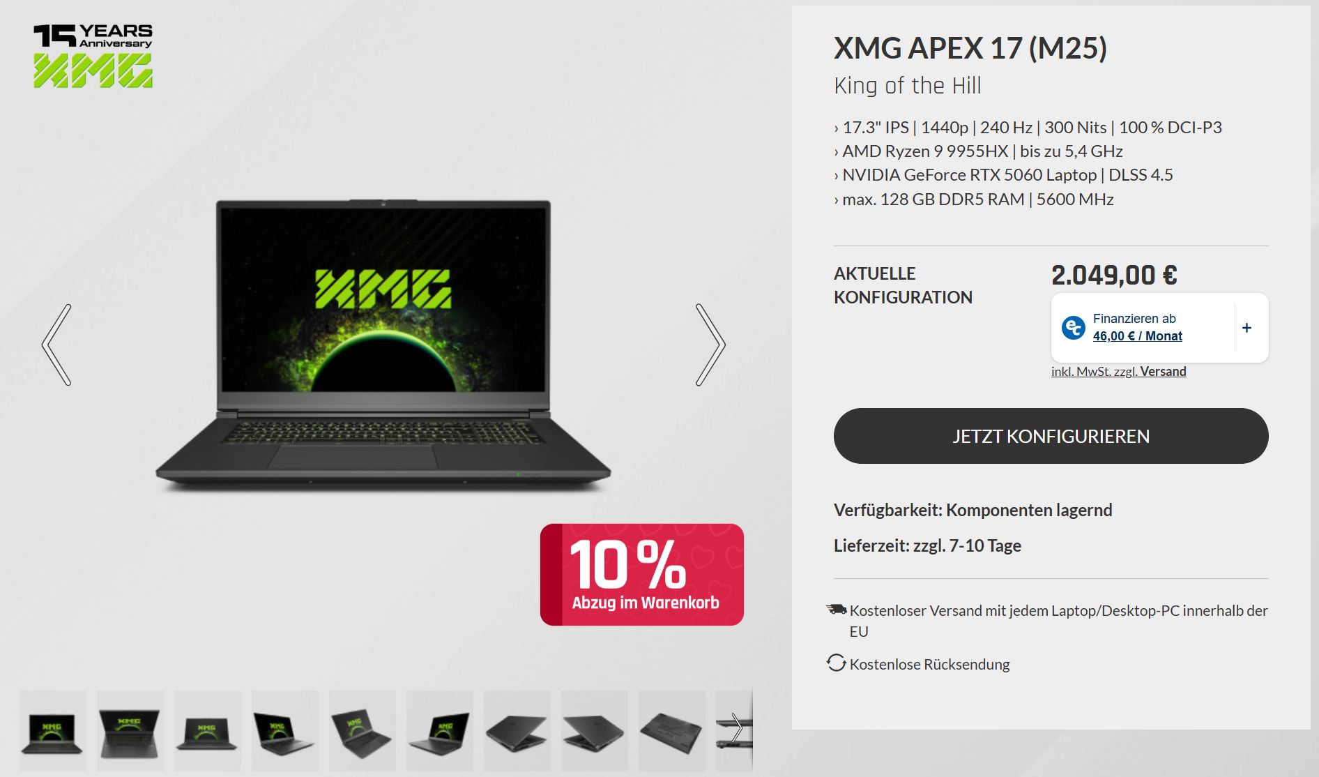 Повышение цены на XMG Apex 17: ноутбук с RTX 5060 теперь стоит 2 049 евро