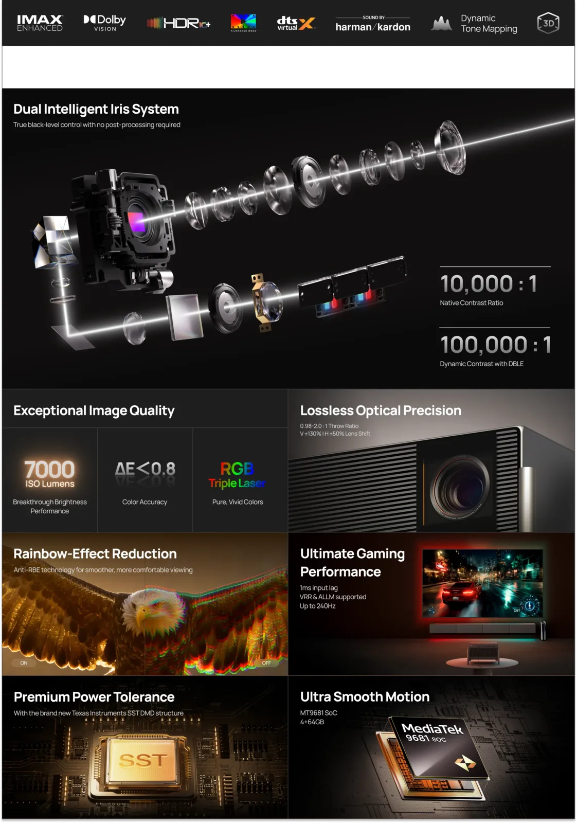Флагманский проектор Titan Noir Max оснащен RGB тройным лазером технологией RGB и системой двойной диафрагмы. Считается, что этот проектор предназначен для специализированных домашних кинотеатров и элитных жилых помещений. Кроме того, проектор может достичь коэффициента контрастности изображения 100000:1 благодаря световому потоку в 7000 ISO.