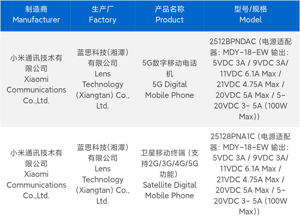 Преемник Xiaomi 15 Ultra был замечен в китайской системе сертификации 3C, где указаны две разные модели. Записи в CCC подтверждают, что оба варианта поддерживают 100-ваттную быструю зарядку - аналогично модели Xiaomi 17, Xiaomi 17 Pro и Xiaomi 17 Pro Max. Согласно сертификации, модели 2512BPNDAC и 25128PNA1C отличаются только возможностью подключения к сотовой сети: Первая поддерживает исключительно сети 5G, в то время как вторая добавляет возможность спутникового подключения (по крайней мере, в Китае). Значительный источник утечек Digital Chat Station утверждает, что этот вариант поддерживает спутниковые SMS Beidou и спутниковые звонки Tiantong