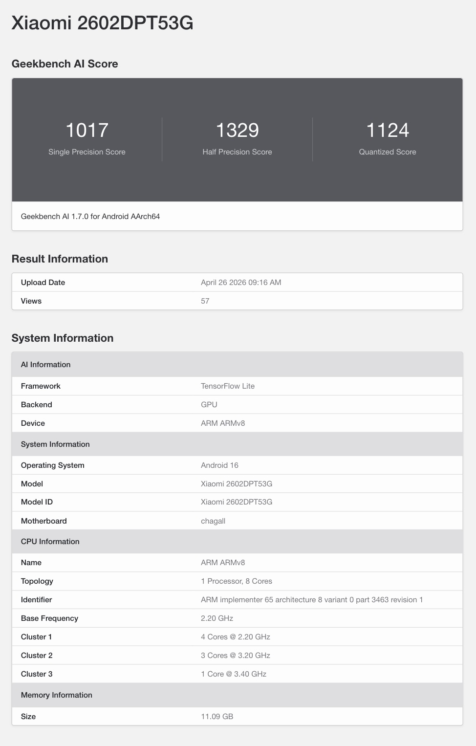 Смартфон появился на сайте Geekbench с модельным номером "2602DPT53G" Для справки, этот же номер модели ранее прошел несколько сертификаций и, как ожидается, относится к стандартной модели Xiaomi 17T.