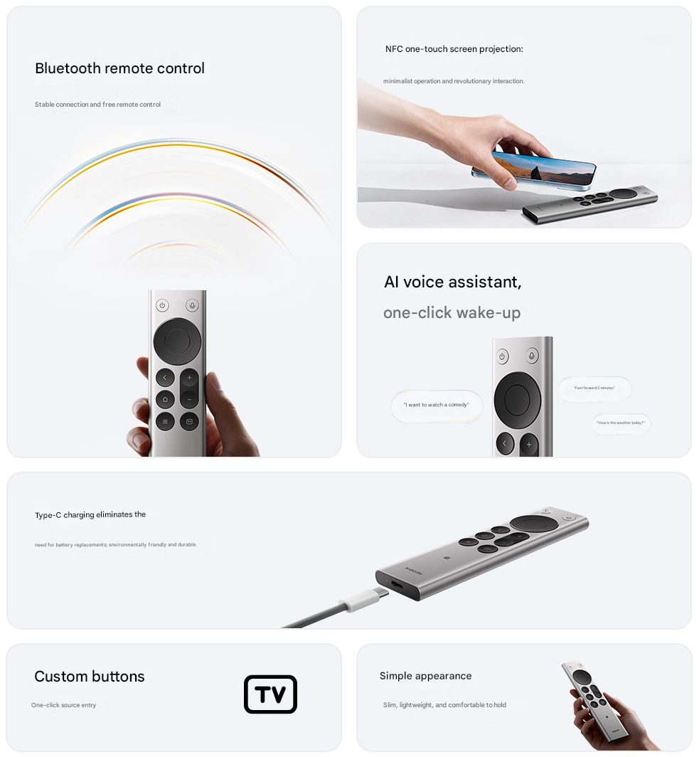 Еще один примечательный момент - минималистичный дизайн. На пульте Bluetooth Remote 2 Pro есть только основные кнопки, а также специальная кнопка голосового помощника AI для голосовых команд. Xiaomi также подчеркивает, что пульт имеет тонкую и легкую конструкцию, что повышает комфорт пользователя.