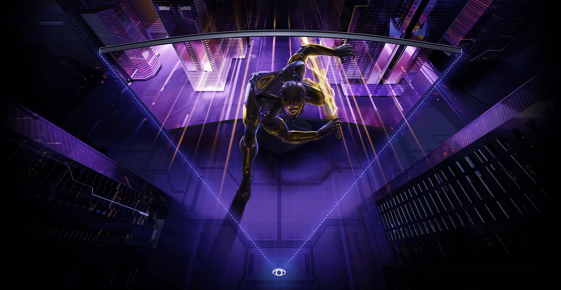 Задняя панель имеет яркий дизайн и оснащена RGB-подсветкой. Здесь находятся два порта HDMI и DisplayPort, но совсем нет портов USB. Монитор можно регулировать по высоте, поворачивать и наклонять с помощью входящей в комплект подставки, а также устанавливать на настенный кронштейн или кронштейн для монитора с помощью VESA. Наконец, радиус кривизны монитора составляет 1 500 миллиметров