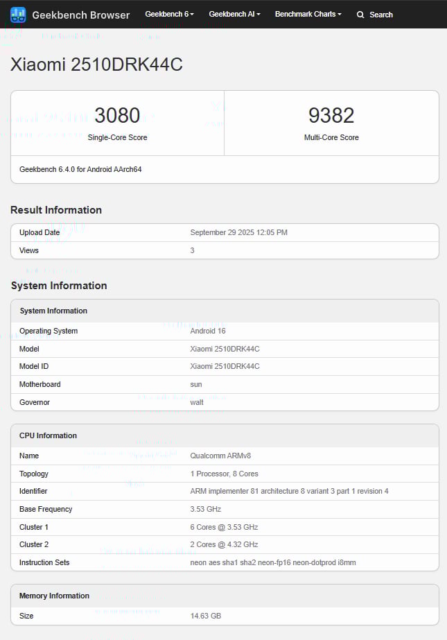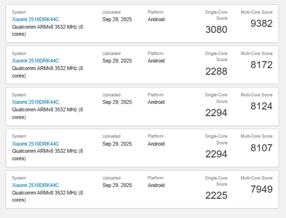 На самом деле, они указывают на то, что компания Xiaomi выбрала тот же чипсет, который она использовала в прошлом году в модели Redmi K80 Pro. В частности, все листинги Geekbench связывают Xiaomi 2510DRK44C с Snapdragon 8 Elite чипсетом и его Adreno 830 GPU. Короче говоря, средние показатели 2 436 и 8 346 в одноядерном и многоядерном бенчмарках Geekbench 6 ниже медианы Snapdragon 8 Elite устройств, которые мы тестировали до сих пор.