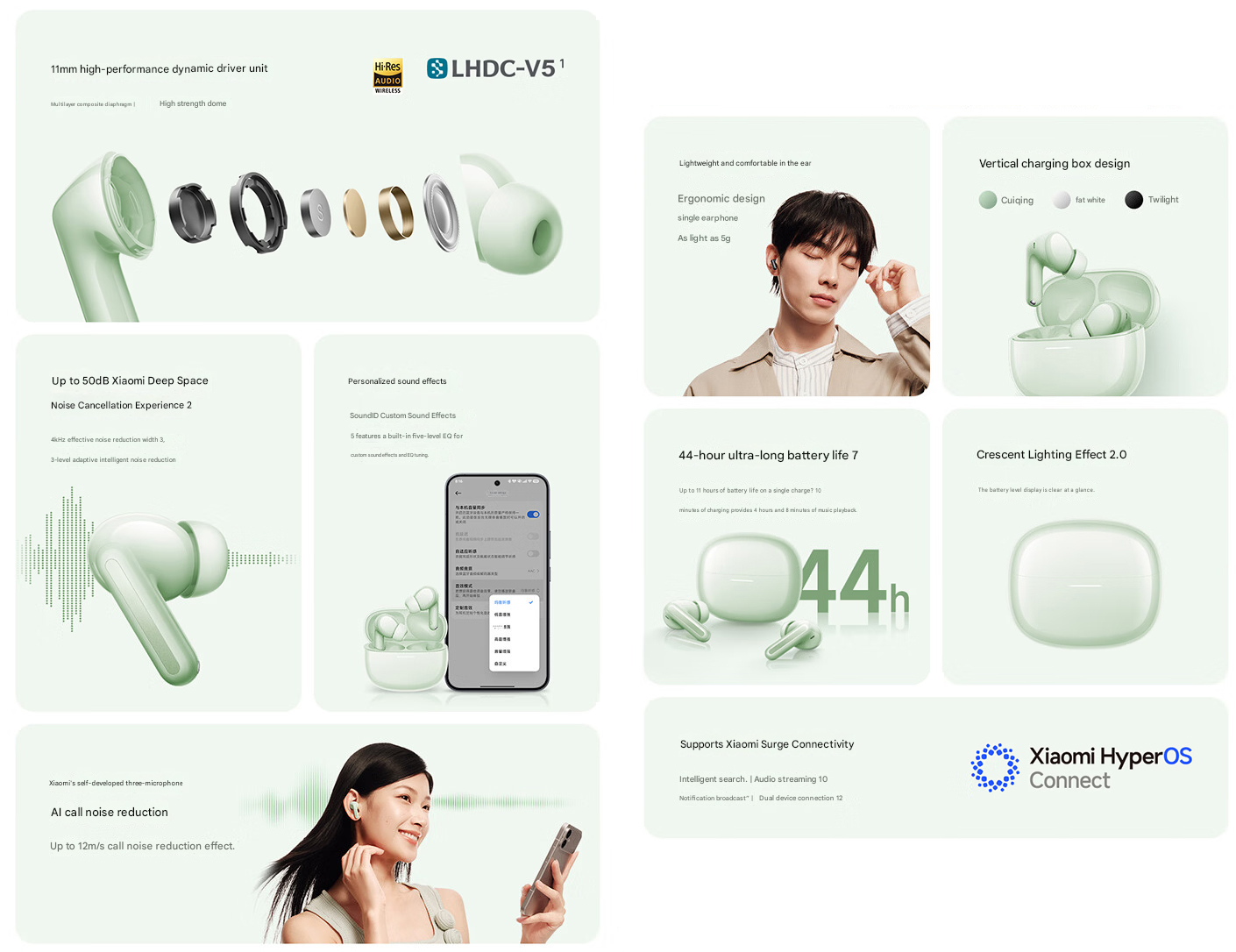 Что касается звука, Xiaomi отмечает, что наушники ANC оснащены 11-миллиметровыми динамическими излучателями с "многослойной композитной мембраной" Имеется поддержка LHDC V5благодаря чему наушники получили сертификат Hi-Res Audio Wireless, но стоит отметить, что этот кодек поддерживается в основном китайскими смартфонами.