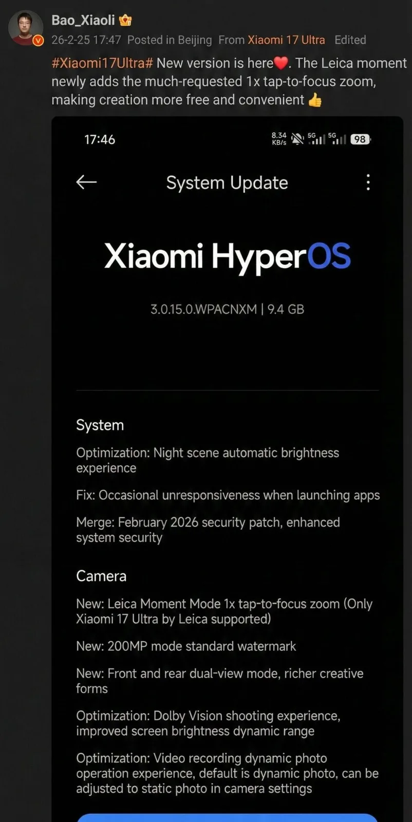 Компания еще не забыла о своих китайских поклонниках. Более того, Xiaomi решила добавить в Xiaomi 17 Ultra функцию, которая ранее была доступна только в Leica Edition. Как видно на скриншоте ниже, февральское обновление 2026 содержит не просто обязательный патч безопасности. Вместо этого оно включает в себя несколько оптимизаций и новых функций, многие из которых направлены на улучшение работы с камерой.