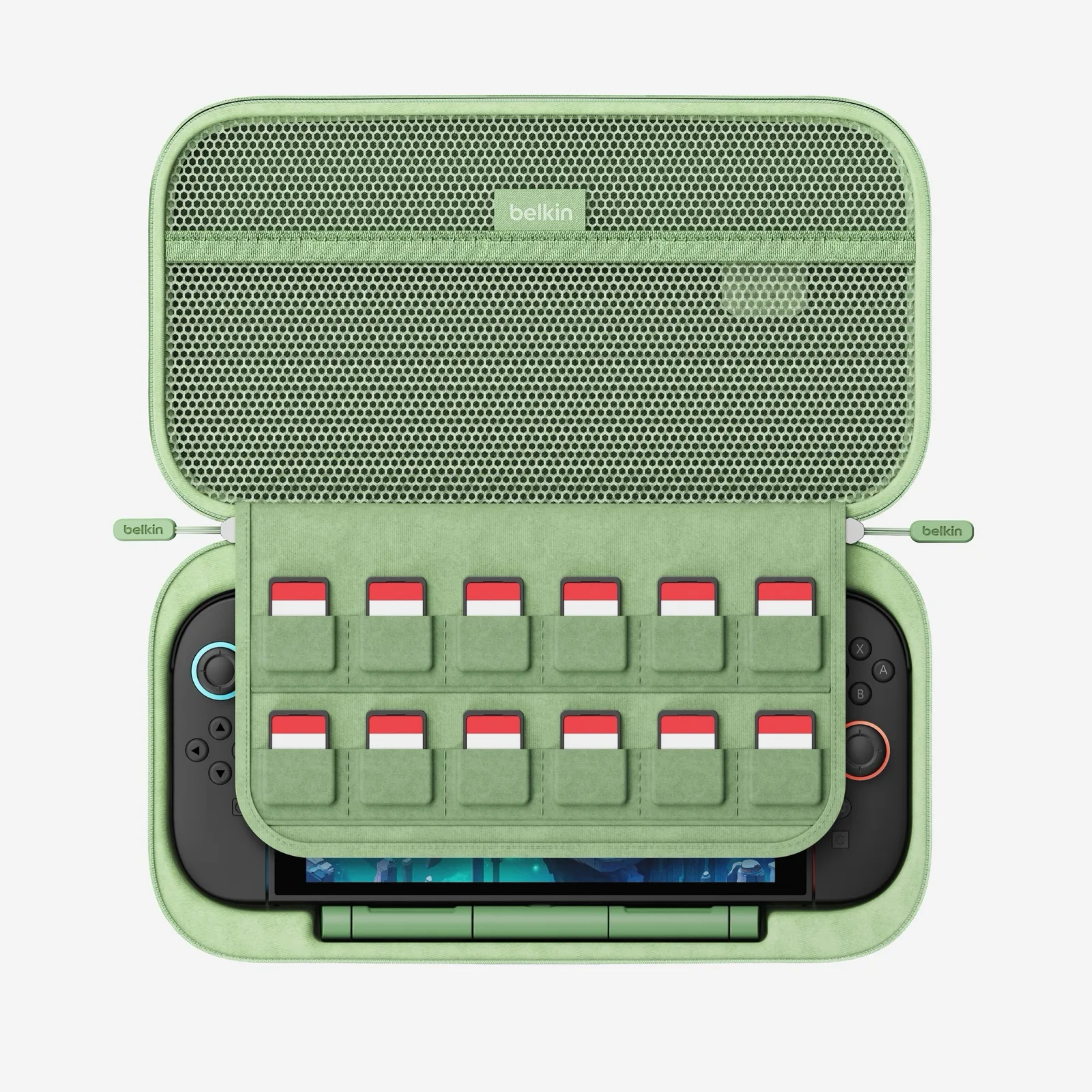 Кроме того, в зарядном кейсе Belkin Charging Case Pro предусмотрено место для двенадцати игровых картриджей и отделение на внутренней стороне крышки, которое можно использовать, в частности, для кабелей или чистящей салфетки из микрофибры. Жесткий корпус обеспечивает оптимальную защиту Nintendo Switch 2, а ручка для переноски облегчает транспортировку. Зарядка Belkin Charging Case Pro осуществляется через порт USB-C на передней панели.