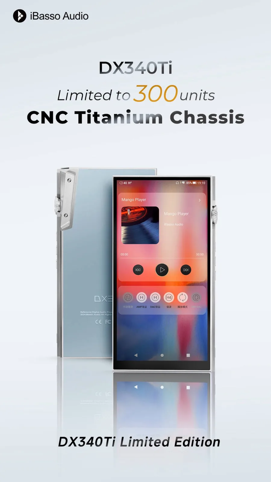 Флагманский музыкальный плеер iBasso DX340 стандартно поставляется с 486-граммовым шасси из нержавеющей стали, но в модели Titanium Limited Edition оно заменено на титановое, изготовленное с помощью ЧПУ. Необычность конструкции заключается даже не только в материале корпуса: открутив два винта снизу, можно снять модуль усилителя AMP15 и заменить его любым модулем iBasso AMP1x.