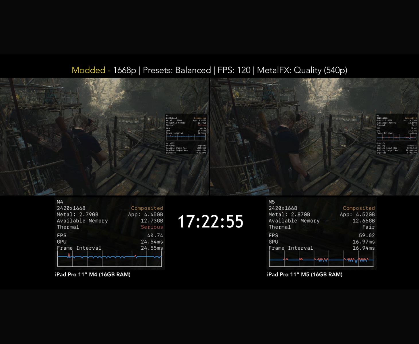 Игра шла с частотой около 60 FPS, когда пользователь изменил файлы конфигурации, установив предустановку "Сбалансированная", понизив разрешение, включив режим "Качество MetalFX" и установив целевое значение FPS на 120. При этих более высоких настройках iPad Pro M5 показал 50-60 FPS. В то же время, M4 iPad Pro опустился до середины 40-х, а M1 с трудом удерживал даже 20 FPS.