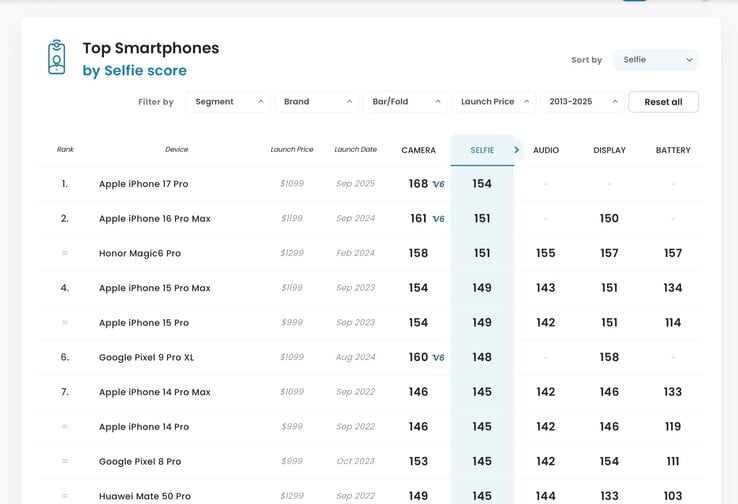 Согласно детальному анализу DxOMark, это обновление явно оправдало себя, поскольку iPhone 17 Pro набрал 154 балла в обзоре камеры selfie и занял первую строчку в таблице лидеров. Apple новый флагман опережает iPhone 16 Pro и Honor Magic6 Pro, которые получили 151 балл и теперь занимают второе место, за ними следуют iPhone 15 Pro с 149 баллами и Google Pixel 9 Pro XL с 148 баллами.