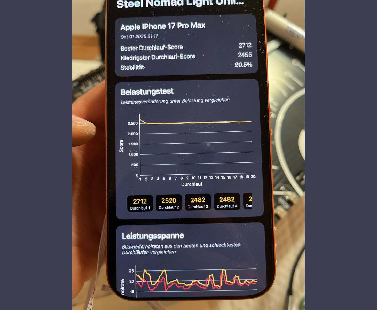 Недавно мы видели, как работает система охлаждения в Apple iPhone 17 Pro Max во время запуска таких ААА-игр, как Assassin's Creed Mirage и Resident Evil 4. IPhone 17 Pro Max не только может запускать такие игры с частотой 60 кадров в секунду, но и делает это без теплового дросселирования. Даже в бенчмарках GPU, таких как стресс-тест 3DMark Solar Bay, iPhone 17 Pro Max показал хорошие результатыособенно учитывая, что теперь он оснащен новым и более мощным чипом A19. Для мобильного вычислительного устройства без активного охлаждения, например, вентилятора, серия iPhone 17 кажется настоящим обновлением по сравнению с серией iPhone 16.