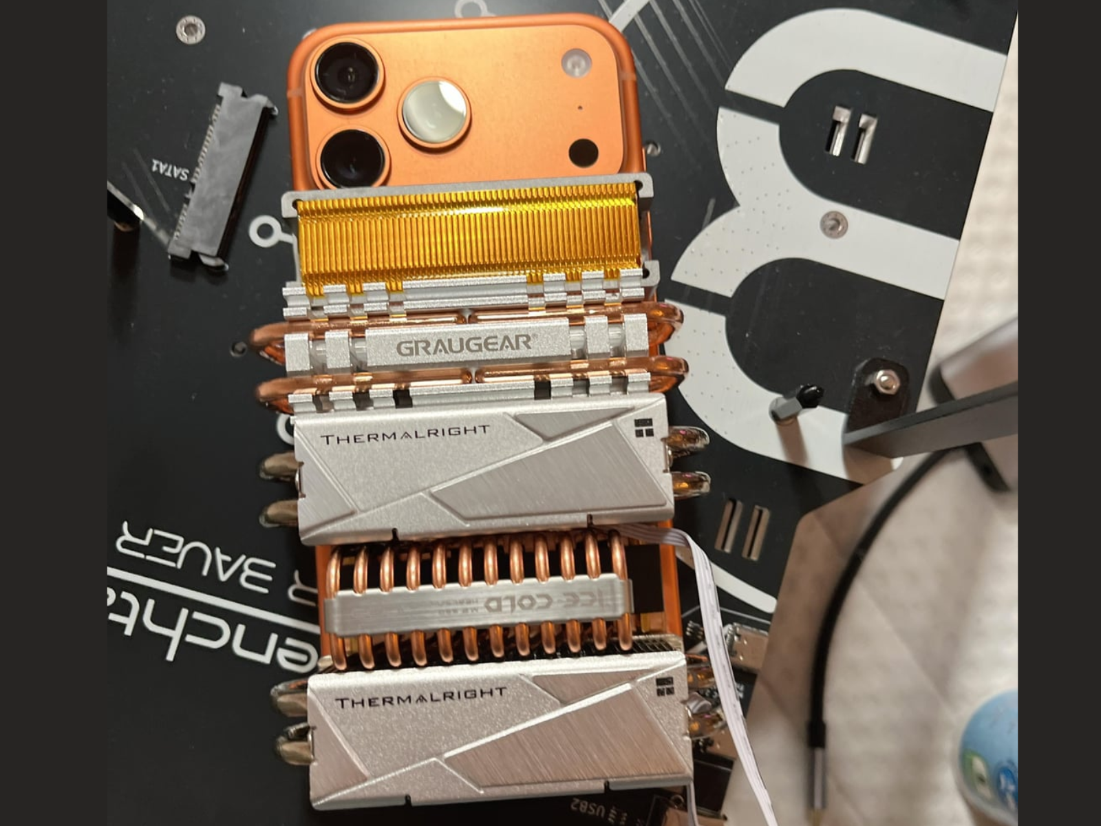 На фотографиях, опубликованных на Reddit под названием "17 Pro Max Cooling with M2 SSD Cooler 90% Stability in 3D Mark Stress Test", показана установка охлаждения "сделай сам", в которой радиаторы и тепловые трубки настольного класса, обычно используемые для SSD, установлены на iPhone 17 Pro Max, чтобы уменьшить тепловое дросселирование во время тяжелых игр или бенчмарков.