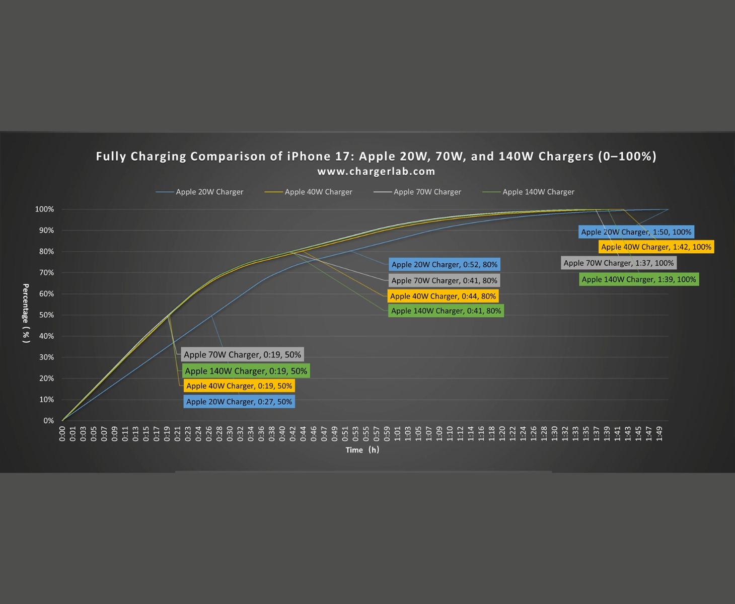 Компания ChargerLAB протестировала, как iPhone 17 с четырьмя адаптерами питания USB-C от Apple20 Вт, 40 Вт, 70 Вт и 140 Вт, используя тестер POWER-Z KM003C и программное обеспечение POWER-Z Lab V2.4 в термобаллоне температурой 25 °C (77 °F).