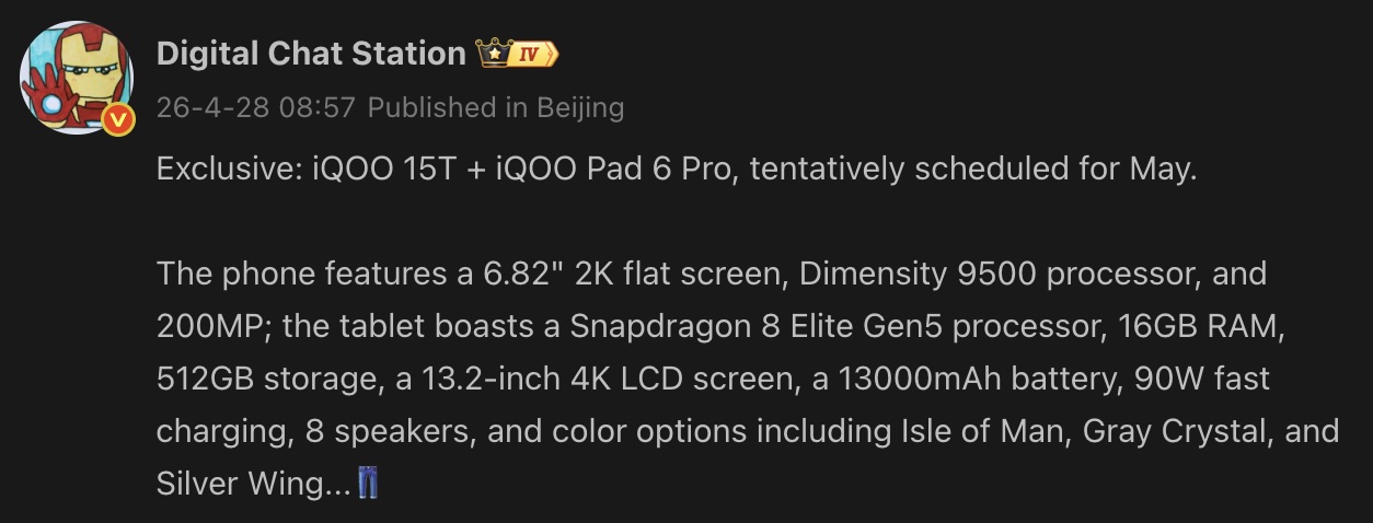 Авторитетный типстер Digital Chat Station поделился подробностями о двух готовящихся к выпуску устройствах iQoo. Сообщается, что компания работает над флагманом Android планшетом под названием iQoo Pad 6 Pro и новым смартфоном высокого класса под названием iQoo 15T.