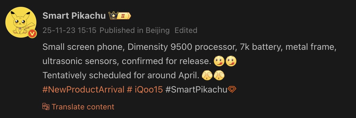 Телефон появлялся в различных утечках ранее, но было неясно, выпустит ли его iQoo. Более ранняя утечка (через GSMArena) предполагала, что телефон отменен. Однако известный типстер Smart Pikachu теперь утверждает, что компактный телефон будет выпущен.